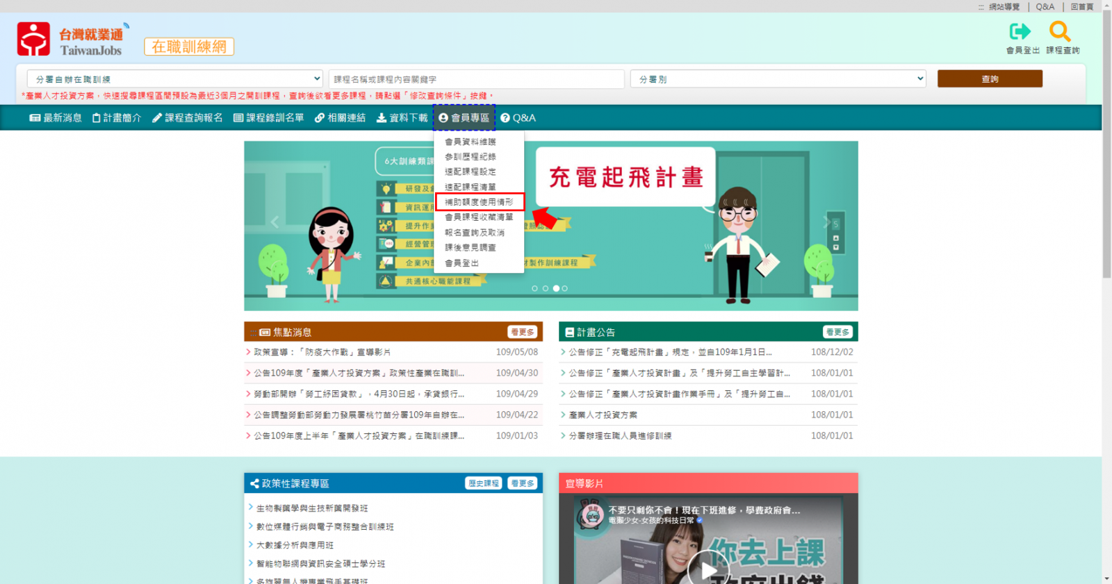 請至在職訓練網首頁-「會員專區」登入-點選「補助額度使用情形」查詢。(如下圖)